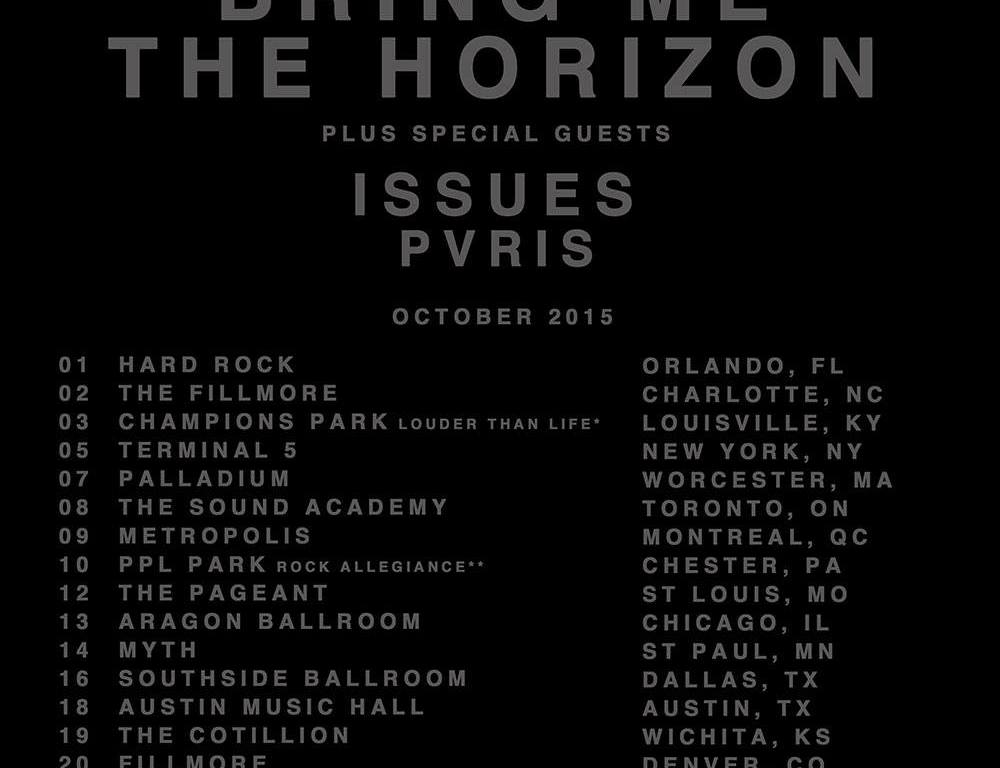 One of the hottest Rock bands out right now released upcoming tour dates for their most recent tour featuring Issues and PVRIS. The British Rock band will play 18 dates throughout the month of October including the Louder Than Life Festival in Louisville at Champions Park on Saturday 10/3 which will also feature a set by Issues. I can’t personally speak on BMTH or Issues live performances as I have yet to see their show. However, PVRIS as a supporting act is as good as it gets! You will want to make sure that you arrive early when these bands come to your city to be sure that you catch PVRIS as they open for BMTH and Issues. Check out our PVRIS photo gallery from a 2014 performance in Newport, KY at The Thompson House.