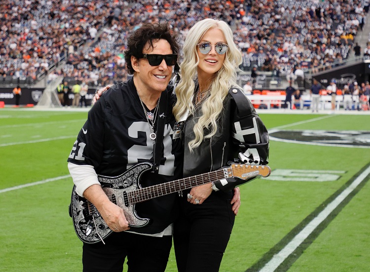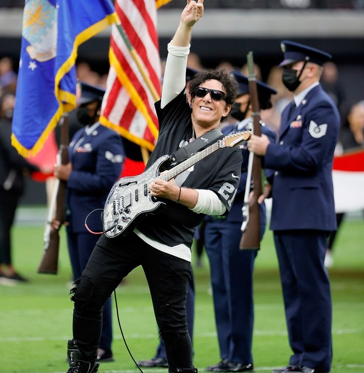 Football fans at the Las Vegas Raiders vs Chicago Bears NFL game at the Allegiant Stadium in Las Vegas, NV were supercharged, on Sunday, with a massive rendition of “The Star Spangled Banner” by iconic JOURNEY founder and guitar legend NEAL SCHON. Marking the first time that the “Star Spangled Banner” has been performed on electric guitar at the new stadium, SCHON’s performance, wielding his custom IHush Lady M Strat, pumped up the crowd for the exciting hometown match-up that saw the team’s first game with fans inside the stadium since the team moved to Las Vegas.