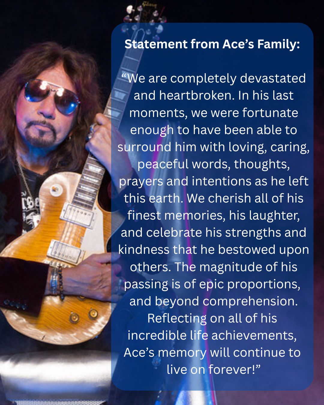 “As a founding member of the rock group KISS and in Ace‘s solo career, Ace influenced and touch the hearts of millions of people. His legacy will live on in the music industry and in the hearts of the KISS Army.