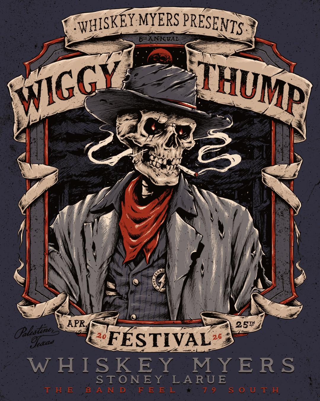 PALESTINE, Texas – Multi-Platinum band Whiskey Myers return to their roots with the eighth annual Wiggy Thump Festival set for April 25, 2026 in Palestine, Texas. Featuring performances by the hometown hosts themselves as well as Stoney LaRue, The Band Feel and 79 South, this year’s event continues the tradition of supporting the local Anderson County Youth Livestock Association and builds upon the more than $250,000 raised for the cause to date. Tickets are on sale now via WhiskeyMyers.com.