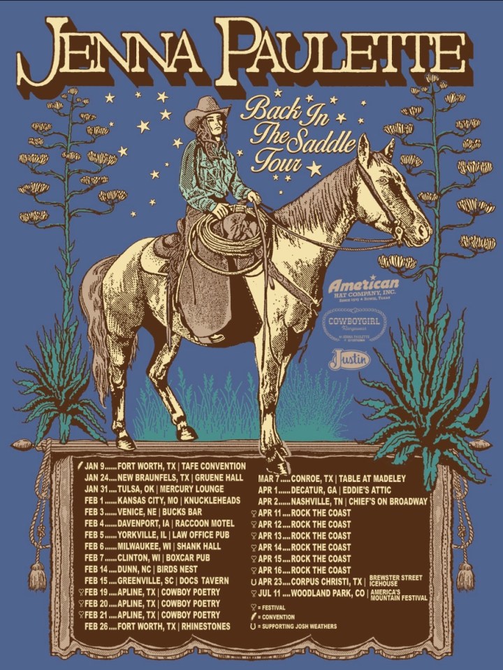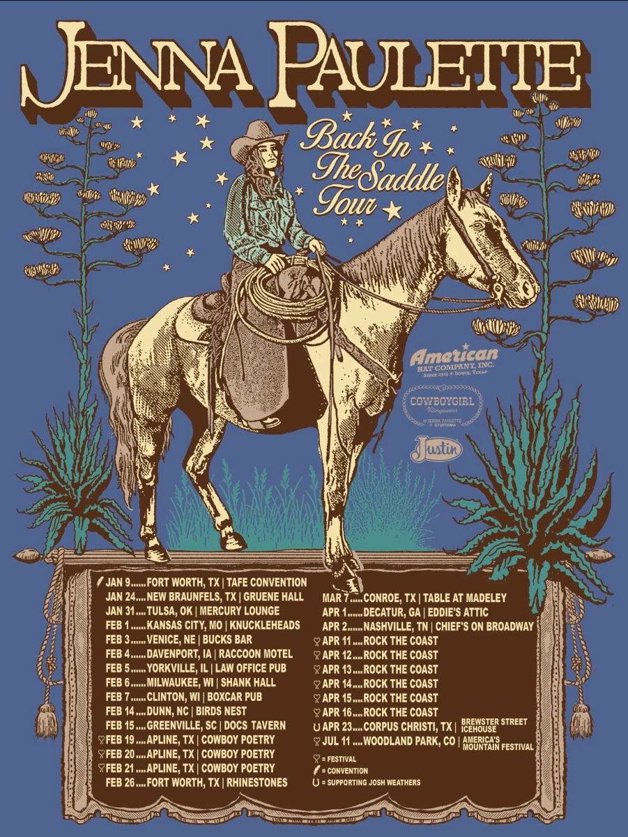 The Back In The Saddle Tour is underway now, and includes stops at the legendary Gruene Hall in New Braunfels, Texas as well as new cities, including Milwaukee, Wisconsin; Tulsa, Oklahoma; Greenville, South Carolina and more. Tickets are available at JennaPaulette.com.