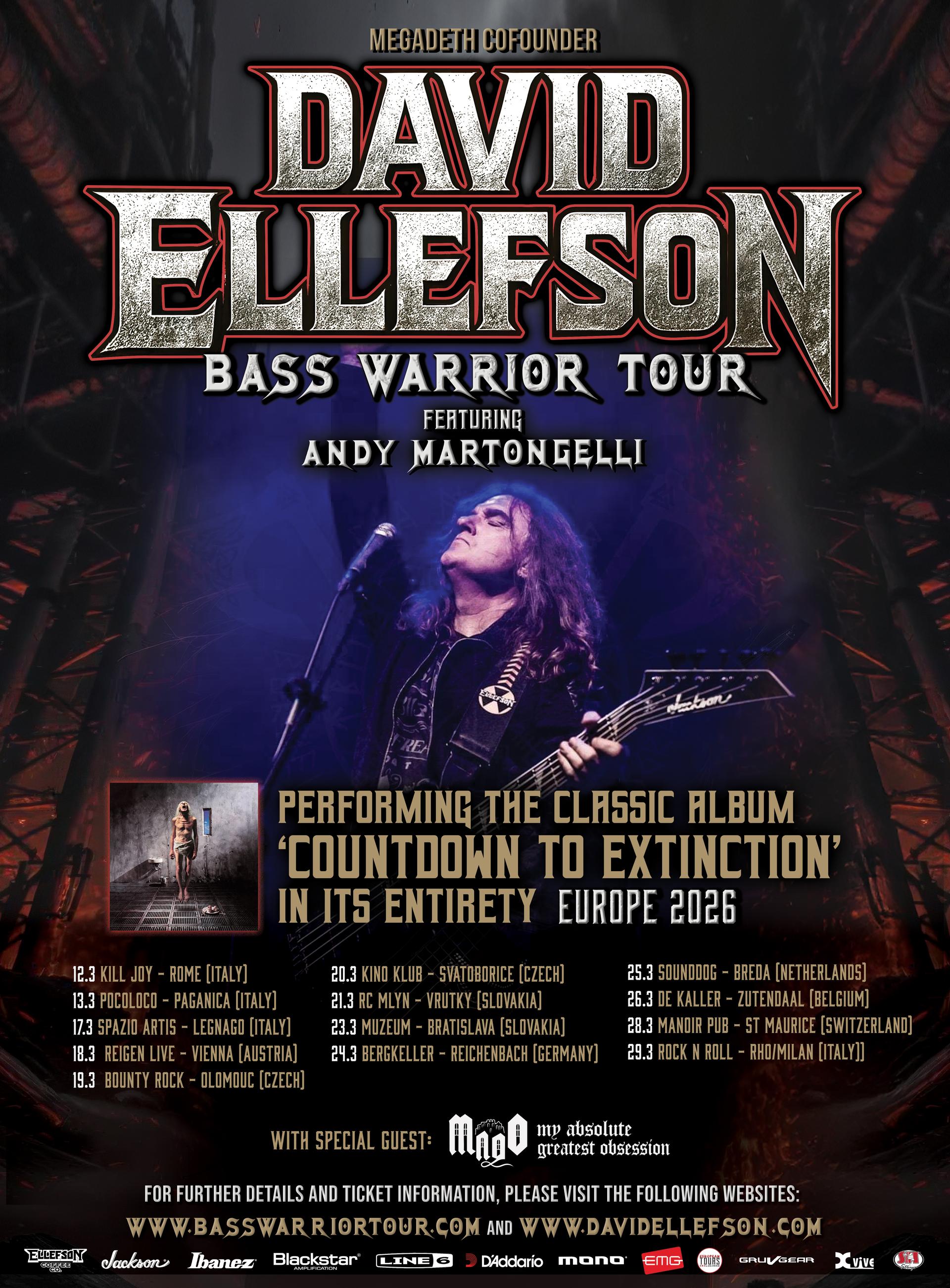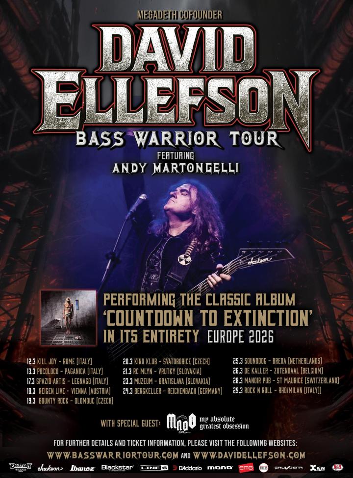GRAMMY Award winning bassist DAVID ELLEFSON has announced his BASS WARRIOR TOUR in Europe for March 2026. The tour will feature Ellefson and his solo band performing select cuts from his well-known catalog of Mega hits, including the Megadeth Countdown to Extinction album in it’s entirety, solo material and other hard rock & metal favorites which inspired him during his 40-year music career. Direct support on all dates is Mado.