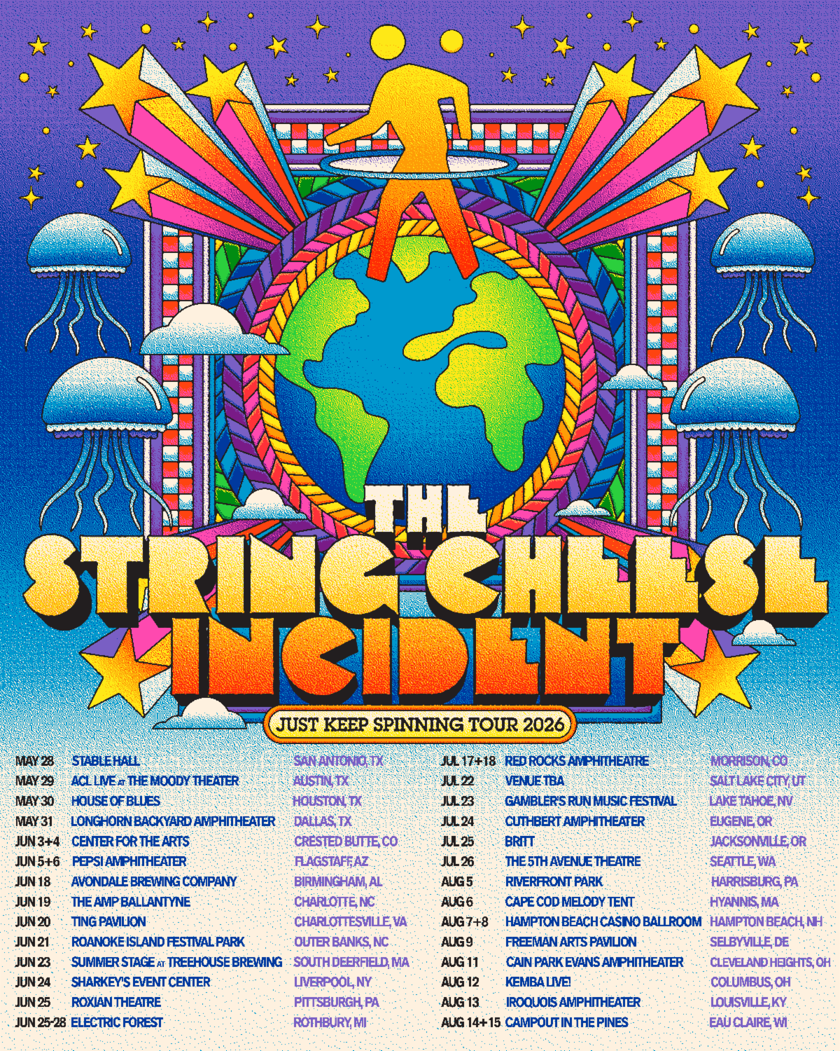 | The String Cheese Incident is thrilled to announce their Just Keep Spinning Tour, a 33-date cross country tour that kicks off on May 28 in San Antonio, TX. The beloved Colorado-based band is renowned for their immersive live performances, seamlessly blending rock, bluegrass, funk, electronic, and world music into genre-defying experiences that resonate across generations. At a time when the world can feel uncertain and overwhelming, SCI invites both longtime fans and new listeners to come together for moments of connection, shared positivity, and the collective joy of live music. The String Cheese Incident is excited to welcome HeadCount along on Just Keep Spinning Tour, to remind us all that the most direct way to make your voice heard is to Just Keep Voting. HeadCount uses the power of music, culture, and community to turn fans into voters. They’re a national, nonpartisan organization working to get more young people civically engaged than any other nonprofit in the country. They meet young people where they already are – at concerts, festivals, and online, and make it easy to register to vote, learn about elections and take part in democracy. Since 2004, they’ve registered over 1.7 million new voters through their work with artists like Ariana Grande, Dave Matthews Band, Harry Styles, Sabrina Carpenter and Green Day. Ticket on-sale schedule and a full list of tour dates can be found below. To purchase tickets and find all up to date information, visit stringcheeseincident.com. Tickets are on sale per below timing:SCI Presale: Wednesday, February 11 at 10:00AM LOCAL (password: STILLSPINNING)General On-Sale: Friday, February 13 at 10:00AM LOCAL* 7/22 Salt Lake City, UT venue is TBA** 7/25 Jacksonville, OR will go on sale Thursday 2/26 THE STRING CHEESE INCIDENT – JUST KEEP SPINNING TOURMay 28 – Stable Hall – San Antonio, TXMay 29 – ACL Live at The Moody Theater – Austin, TXMay 30 – House of Blues – Houston, TXMay 31 – Longhorn Backyard Amphitheater – Dallas, TXJune 3+4 – Center for the Arts – Crested Butte, COJune 5+6 – Pepsi Amphitheater – Flagstaff, AZJune 18 – Avondale Brewing Company – Birmingham, ALJune 19 – The Amp Ballantyne – Charlotte, NCJune 20 – Ting Pavilion – Charlottesville, VAJune 21 – Roanoke Island Festival Park – Outer Banks, NCJune 23 – Summer Stage at Treehouse Brewing – South Deerfield, MAJune 24 – Sharkey’s Event Center – Liverpool, NY June 25 – Roxian Theatre – Pittsburgh, PAJune 27 – Electric Forest – Rothbury, MI July 17+18 – Red Rocks Amphitheatre – Morrison, CO*July 22 – Venue TBA – Salt Lake City, UT July 23 – Gambler’s Run Music Festival – Lake Tahoe, NV July 24 – Cuthbert Amphitheater – Eugene, OR July 25 – Britt – Jacksonville, OR July 26 – The 5th Avenue Theatre – Seattle, WAAug 5 – Riverfront Park – Harrisburg, PAAug 6 – Cape Cod Melody Tent – Hyannis, MAAug 7+8 – Hampton Beach Casino Ballroom – Hampton Beach, NHAug 9 – Freeman Arts Pavilion – Selbyville, DEAug 11 – Cain Park Evans Amphitheater – Cleveland Heights, OHAug 12 – KEMBA Live! – Columbus, OHAug 13 – Iroquois Amphitheater – Louisville, KYAug 14+15 – Campout in the Pines – Eau Claire, WI** *with Clay Street Unit on 7/17**with Leftover Salmon, Lettuce, Eggy, and Dogs in a Pile |