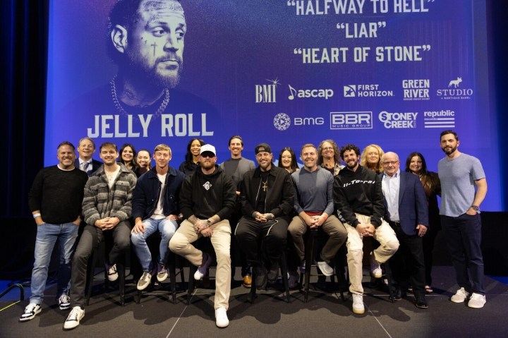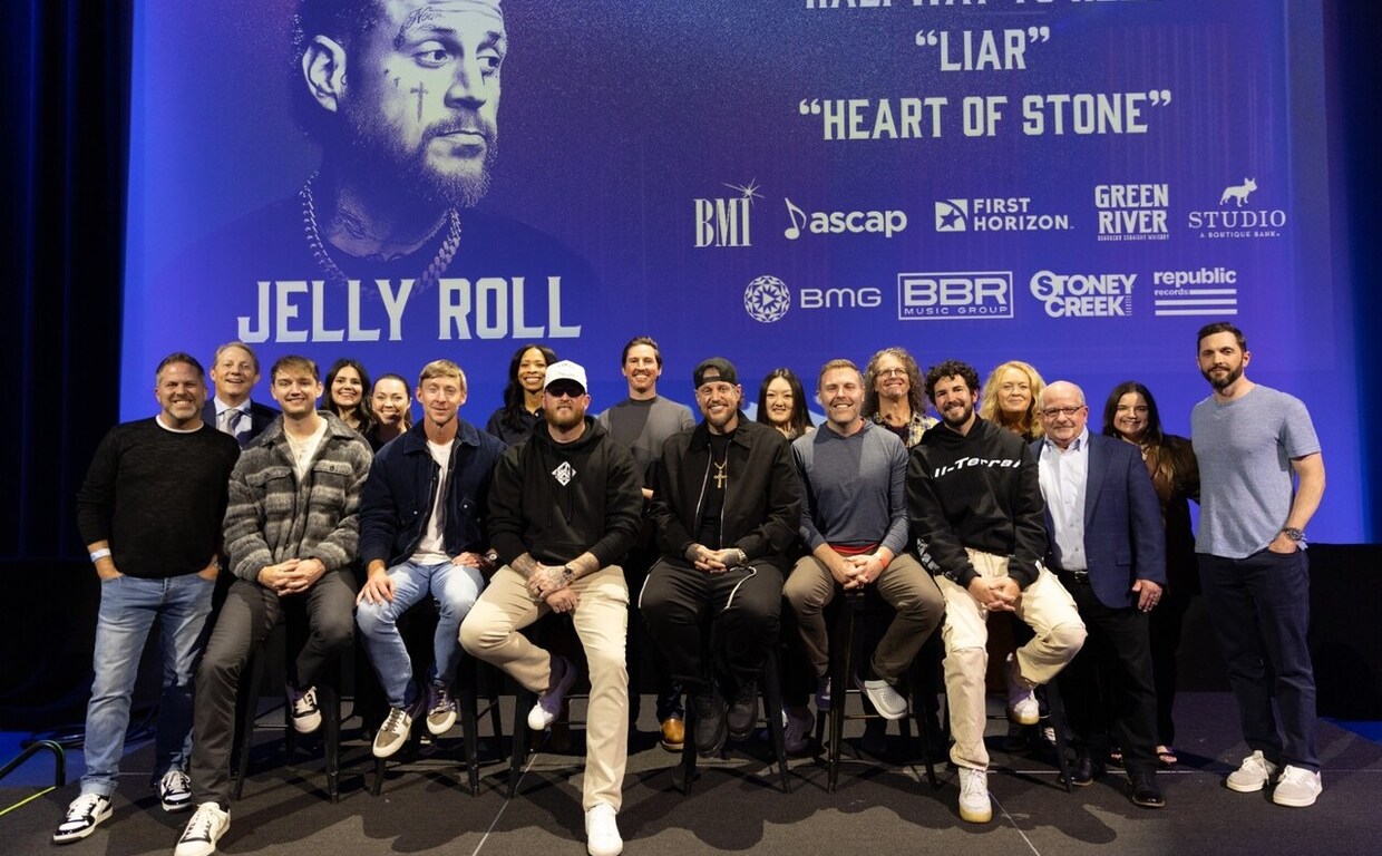 NASHVILLE, TN – March 11, 2026 – BMI’s multi-GRAMMY® award-winning Nashville native Jelly Roll threw a triple No. One celebration yesterday (3/10) at the Grand Ole Opry’s Studio A, before his member induction. The BBR Music Group/BMG Nashville/Republic recording artist celebrated three of his eight consecutive career toppers as he was reunited with the songwriters, producer and publishers behind “Liar,” “Heart of Stone” and “Halfway to Hell.”