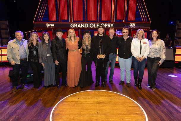 l to r: Opry’s Dan Rogers, Opry host Kelly Sutton, Lily Isaacs, Larry Gatlin, Leanne Morgan, Lainey Wilson, Jelly Roll, Craig Morgan, ERNEST, Sonya Isaacs and Opry’s Jenn Tressler