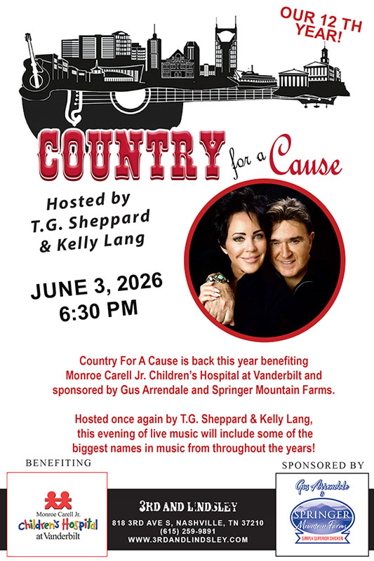 NASHVILLE, Tenn. (March 13, 2026) – Darin & Brooke Aldridge, John Berry, Allie Colleen, Linda Davis, Hannah Dasher, Ty Herndon, Jake Hoot, Dani-elle Kleha, The Kody Norris Show, The Malpass Brothers, Neal McCoy, Makenzie Phipps, Mark Wills, and more will join hosts, T.G. Sheppard and Kelly Lang along with Devon O’Day for the 12th Annual Country For A Cause at Nashville’s 3rd & Lindsley, Wednesday, June 3 at 6:30 PM benefitting Monroe Carell Jr. Children’s Hospital at Vanderbilt. The show is presented by Gus Arrendale and Springer Mountain Farms. Tickets are on sale now and are $55 for general admission, with a VERY limited number of VIP tables available.