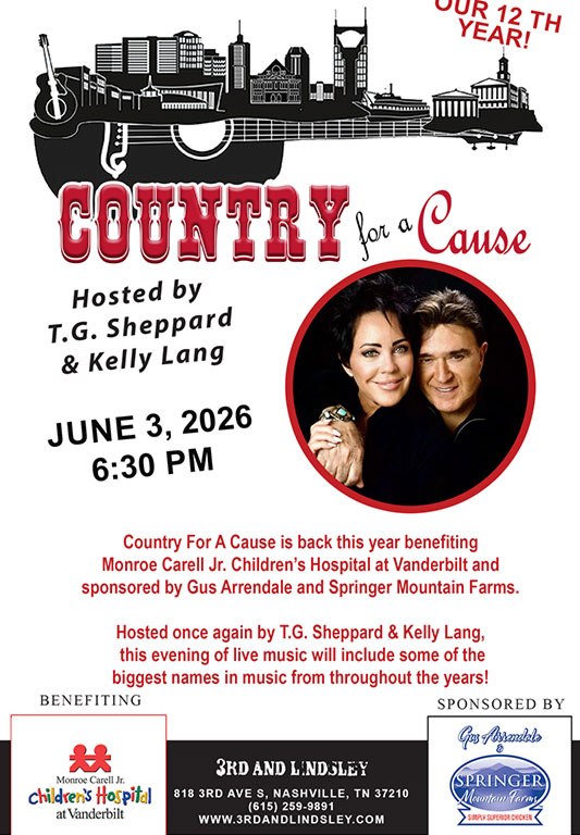 NASHVILLE, Tenn. (March 13, 2026) – Darin & Brooke Aldridge, John Berry, Allie Colleen, Linda Davis, Hannah Dasher, Ty Herndon, Jake Hoot, Dani-elle Kleha, The Kody Norris Show, The Malpass Brothers, Neal McCoy, Makenzie Phipps, Mark Wills, and more will join hosts, T.G. Sheppard and Kelly Lang along with Devon O’Day for the 12th Annual Country For A Cause at Nashville’s 3rd & Lindsley, Wednesday, June 3 at 6:30 PM benefitting Monroe Carell Jr. Children’s Hospital at Vanderbilt. The show is presented by Gus Arrendale and Springer Mountain Farms. Tickets are on sale now and are $55 for general admission, with a VERY limited number of VIP tables available.