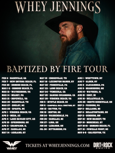 | 2026 Baptized By Fire Tour Dates:MAR 27 – Shelby, N.C. [Info/Tickets]MAR 28 – Sparta, N.C. [Info/Tickets]APR 01 – **Virginia Beach, Va. [Tune-In]APR 03 – Mesa, Ariz. [Info/Tickets]APR 04 – Lake Havasu City, Ariz. [Info/Tickets]APR 10 – Springboro, Ohio [Info/Tickets]APR 11 – Champaign, Ill. [Info/Tickets]APR 17 – Cadillac, Mich. [Info/Tickets]APR 19 – Allegheny County, Pa. [Info/Tickets TBA] MAY 09 – Winchester, Va. [info/tickets TBA] MAY 14 – Ashland, Ky. [Info/Tickets]MAY 15 – Crossville, Tenn. [Info/Tickets]MAY 18 – Lexington, Ky. [Info/Tickets]MAY 22 – Forksville, Pa. [Info/Tickets]MAY 23 – Long Beach, Calif. [Info/Tickets]MAY 24 – Temecula, Calif. [Info/Tickets]MAY 25 – Rancho Cucamonga, Calif. [Info/Tickets]MAY 29 – Virginia Beach, Va. [Info/Tickets] MAY 31– Nashville, Tenn. – Baptized By Fire Album Celebration [Info/Tickets]JUN 05 – Myrtle Beach, S.C. [Info/Tickets]JUN 06 – Campbell Hall Junction, N.Y. [Info/Tickets] JUN 11 – New Braunfels, Texas JUN 12 – Dayton, Texas [Info/Tickets]JUN 20 – Hinton, Okla. [Info/Tickets]JUN 24 – Warrendale, Pa. [Info/Tickets]JUN 26 – Cadillac, Mich. [Info/Tickets]JUN 27 – Lima, Ohio [Info/Tickets]JUN 28 – Lebanon, Ohio [Info/Tickets]JUL 11 – Salisbury, Pa. [Info/Tickets]JUL 16 – Trout Creek, Mt. [Info/Tickets]JUL 17 – Riggins, Id. [Info/Tickets TBA] JUL 18 – Lewiston, Id. [Info/Tickets TBA]JUL 30 – Kittanning, Pa. [Info/Tickets]AUG 01 – Westtown, N.Y. [Info/Tickets]AUG 07 – Alden, N.Y. [Info/Tickets]AUG 08 – Alexandria, Pa. [Info/Tickets]AUG 09 – Miamisburg, Ohio [Info/Tickets]AUG 14 – Watseka, Ill. [Info/Tickets]AUG 15 – Cory, Ind. [Info/Tickets]AUG 16 – Belleville, Ill. [Info/Tickets]AUG 28 – Clayville, N.Y. [info/tickets TBA]AUG 23 – Meadville, Pa. [info/tickets]AUG 29 – North Ridgeville, Ohio [Info/Tickets]SEP 03 – Foxburg, Pa. [Info/Tickets]SEP 06 – Bellefontaine, Ohio [Info/Tickets]SEP 11 – Sunburg, Minn. [Info/Tickets]SEP 12 – Fond Du Lac, Wisc. [info/tickets TBA]SEP 18 – New Market, Tenn. [Info/Tickets]SEP 19 – Morehead, Ky. [Info/Tickets]OCT 16-18 – Ormond Beach, Fla. [Info/Tickets]OCT 31 – Powells Point, N.C. [Info/Tickets]NOV 6-8 – Galveston, Texas [Info/Tickets]Additional dates TBA on BandsInTown or WheyJennings.com/#tour**Appearance only About Whey Jennings: Country singer-songwriter Whey Jennings was born into one of country music’s most iconic family names, first emerging in 2012 as another naturally gifted singer from the Jennings tribe. With large boots to fill, the young Nashville recording artist and singer-songwriter for Dirt Rock Empire, with a booming baritone voice as big as Texas, finds himself with a few expectations to live up to. Seeking to establish his own musical legacy as one of the few remaining torch-bearing country traditionalists out there, Whey can instantly take his fans back to a time and sound his Grandfather Waylon and Grandmother Jessi gave birth to in the 70’s, even with his own songs. Jennings has three studio recorded EP releases under his belt, 2020’s Gypsy Soul, 2022’s If It Wasn’t for The Sinnin’, and 2023’s Just Before The Dawn. In the summer of 2024, Whey released his critically acclaimed, highly anticipated first full length album, Jekyll & Hyde, which premiered at #10 on Apple iTunes Top 40 Country Albums Chart, and #7 on iTopChart’s Top Country Music Album Chart. Jekyll & Hyde has been hailed by Fox News, Billboard, People Magazine, Forbes, Cowboys & Indians, Men’s Journal, Rodeo Life Magazine and recognized as one of the most anticipated albums of 2024 by SavingCountryMusic.com. His sophomore album, Baptized By Fire, is due out March 27, 2026. Many of Whey’s songs reveal real-life stories of how he has come to terms with and recovered from his checkered past of too much partying, led by a drug-fueled lifestyle. Songs about struggles, addiction, finding sobriety, and redemption through faith in God, family and his friends. Whey is forging his craft of straightforward songwriting and storytelling, while remaining a little rough around the edges. His unpolished grit and honest demeanor defines his sound, mixed with musical roots that run as deep as his famous Jennings family name would imply. # # # |