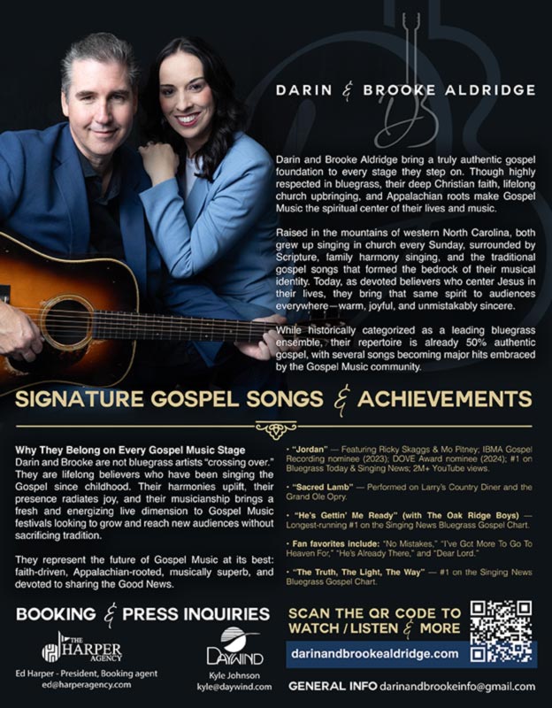 | NASHVILLE, Tenn. – Multi-award-winning bluegrass favorites Darin & Brooke Aldridge are excited to release their new album, ‘Soul Condition,’ available today on Billy Blue Records. The eleven-track collection showcases the heartfelt faith and soaring harmonies fans have come to expect from the duo. Marking their 11th studio album, the project features special appearances from Sonya Isaacs and Becky Isaacs of The Isaacs—both members of the Grand Ole Opry—as well as GRAMMY-winning gospel standout Jason Crabb and more. Blending powerful collaborations with their signature bluegrass-and-gospel sound, the album underscores the duo’s continued commitment to inspirational music rooted in tradition while connecting with listeners across generations. Songs from the album were premiered by GodTube, Bluegrass Today, and The Music Universe. Darin & Brooke celebrated the release of ‘Soul Condition’ with appearances on ‘Talk of the Town’ on WTVF (CBS) News Channel 5 in Nashville, RFD-TV, Y’all FM 106.7 in Nashville, ‘Coffee, Country, & Cody’ on WSM 650-AM The Legend, and the world-famous Grand Ole Opry. To purchase/stream: billyblue.ffm.to/dba_sc “‘Soul Condition’ is more than a collection of songs—it’s an album pieced together with care, each track chosen for its ability to reach beyond how we sing and play, touching the deepest places of the soul. It captures not only our D&B sound, but the spirit and Appalachian heritage that helped shape who we are.” – Darin and Brooke Aldridge They recently released their uplifting new single, “You Don’t Knock,” featuring John Cowan (of New Grass Revival and The Doobie Brothers). The unmistakable blend of their combined vocals brings a whole new level of soul to the track, creating a powerful, feel-good energy that leaves listeners hitting repeat. A joyful, stand-up-and-sing-along gospel anthem, “You Don’t Knock” is already generating buzz following its premiere with GodTube and has quickly become a fan favorite, going to #1 on Bluegrass Today’s weekly Gospel Chart. To see the premiere with GodTube, visit HERE. ‘Soul Condition’ Track Listing: “You Don’t Knock” (feat. John Cowan) – (Premiered by GodTube)“Your Unfailing Love ”“I’m Going Up When He Starts Down” – (Premiered by Bluegrass Today)“It’ll Be Worth It After All” (feat. Jason Crabb) – (Premiered by The Music Universe)“So Much To Thank Him For ”“Bought By the Blood ”“Heaven Is Your Hometown ”“When He Beckons Me Home To Stay ”“I’ll Wear A White Robe ”“Where Could I Go But To The Lord ”“When We’re Gone We’re Long Gone” (feat. Sonya Isaacs Yeary and Becky Isaacs Bowman) Darin & Brooke Aldridge Tour Schedule: APR 18 – Crest High School / Shelby, N.C. MAY 14 – Silver Dollar City / Branson, Mo. MAY 30 – NEPA Bluegrass Festival / Tunkhannock, Pa. JUN 03 – Country For A Cause / Nashville, Tenn. JUN 13 – Pammy Fest / Moore County, N.C. JUN 19 – Bill Monroe Bluegrass Festival / Morgantown, Ind. JUN 20 – Willow Oak Bluegrass Festival / Roxboro, N.C. JUN 28 – Grandfather Mountain State Park / Banner Elk, N.C. JUL 03 – High Point Theatre / High Point, N.C.JUL 05 – Country Music Hall of Fame / Nashville, Tenn. JUL 12 – Frankfort Bluegrass Festival / Frankfort, Ill. For additional information, visit HERE. # # # Website | Facebook | Instagram | YouTube | X ABOUT DARIN & BROOKE ALDRIDGE: Darin and Brooke Aldridge continue to ascend to new heights in the music industry while keeping their easy-going, down-to-earth connection with audiences everywhere. Brooke is a four-time winner of the International Bluegrass Music Association (IBMA) award for Female Vocalist of the Year, while Darin, a former member of The Country Gentlemen, is a former IBMA Mentor of the Year and a truly gifted singer and multi-instrumentalist. They have had numerous nominations over the years from the IBMA, the Society for the Preservation of Bluegrass Music in America (SPBGMA), the Gospel Music Association (GMA Dove Awards), and the Inspirational Country Music Association. In April 2023, they were named “Bluegrass Artist of the Year” at the Absolutely Gospel Music Awards. Also in 2023, the IBMA nominated the smash hit collaboration “Jordan” featuring Ricky Skaggs, Mo Pitney, and Mark Fain, in the Gospel Recording of the Year category, while the GMA nominated the song for its Bluegrass/Country/Roots Recorded Song of the Year award. The North Carolina natives have enjoyed top spots on the Billboard Bluegrass Album, SiriusXM’s Bluegrass Junction, Bluegrass Today, Bluegrass Unlimited, Americana/Roots, and Gospel charts. Their music videos have been featured on Country Music Television (CMT), CMT Edge, Great American Country (GAC), Bluegrass Ridge TV, and The Bluegrass Situation. Their television appearances include PBS’ Mountain Stage, Songs of the Mountain and Music City Roots; RFD-TV’s Larry’s Country Diner, Country’s Family Reunion and The Woodsongs Old Time Radio Hour; Great American Gospel; The Bluegrass Road and Blue Highways TV. They have graced the stage of the Grand Ole Opry more than 50 times. A career highlight came on the group’s 2021 release, ‘This Life We’re Livin’, as the Gospel single “He’s Getting Me Ready,” featured Country Music Hall of Fame members The Oak Ridge Boys. The song spent an incredible, record-setting five months atop The Singing News Bluegrass Gospel chart. |